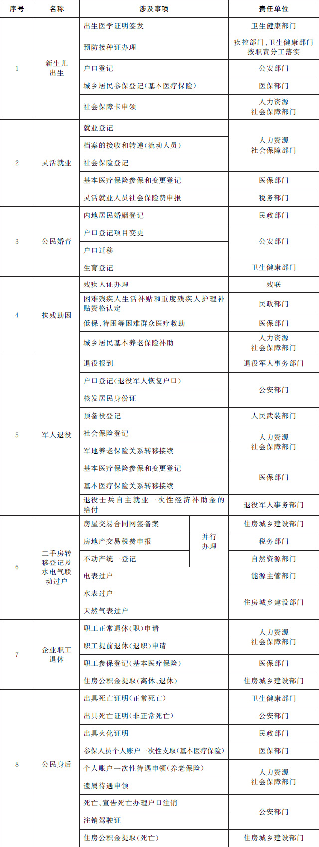 (二)推進(jìn)個(gè)人全生命周期相關(guān)政務(wù)服務(wù)事項(xiàng)“一件事一次辦”。圍繞個(gè)人從出生到身后全生命周期的重要階段,梳理集成同一階段內(nèi)需要辦理的多個(gè)單一政務(wù)服務(wù)事項(xiàng),為群眾提供新生兒出生、入園入學(xué)、大中專學(xué)生畢業(yè)、就業(yè)、就醫(yī)、婚育、扶殘助困、軍人退役、二手房交易及水電氣聯(lián)動(dòng)過戶、退休、身后等集成化辦理服務(wù),切實(shí)提升群眾辦事便捷度,減少跑動(dòng)次數(shù)。