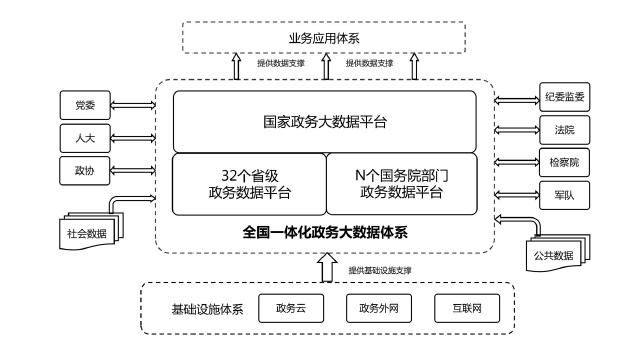 全國一體化政務(wù)大數(shù)據(jù)體系包括三類平臺(tái)和三大支撐。三類平臺(tái)為“1+32+N”框架結(jié)構(gòu)。“1”是指國家政務(wù)大數(shù)據(jù)平臺(tái),是我國政務(wù)數(shù)據(jù)管理的總樞紐、政務(wù)數(shù)據(jù)流轉(zhuǎn)的總通道、政務(wù)數(shù)據(jù)服務(wù)的總門戶;“32”是指31個(gè)?。ㄗ灾螀^(qū)、直轄市)和新疆生產(chǎn)建設(shè)兵團(tuán)統(tǒng)籌建設(shè)的省級政務(wù)數(shù)據(jù)平臺(tái),負(fù)責(zé)本地區(qū)政務(wù)數(shù)據(jù)的目錄編制、供需對接、匯聚整合、共享開放,與國家平臺(tái)實(shí)現(xiàn)級聯(lián)對接;“N”是指國務(wù)院有關(guān)部門的政務(wù)數(shù)據(jù)平臺(tái),負(fù)責(zé)本部門本行業(yè)數(shù)據(jù)匯聚整合與供需對接,與國家平臺(tái)實(shí)現(xiàn)互聯(lián)互通,尚未建設(shè)政務(wù)數(shù)據(jù)平臺(tái)的部門,可由國家平臺(tái)提供服務(wù)支撐。三大支撐包括管理機(jī)制、標(biāo)準(zhǔn)規(guī)范、安全保障三個(gè)方面。