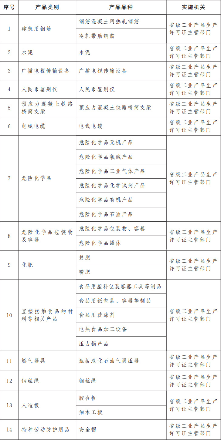 為保障重要工業(yè)產(chǎn)品質(zhì)量安全,強化產(chǎn)品準入管理和源頭治理,防范產(chǎn)品質(zhì)量安全重大風(fēng)險,確保人民群眾生命財產(chǎn)安全和公共安全,國務(wù)院決定,調(diào)整完善工業(yè)產(chǎn)品生產(chǎn)許可證管理目錄,對冷軋帶肋鋼筋、瓶裝液化石油氣調(diào)壓器、鋼絲繩、膠合板、細木工板、安全帽等6種產(chǎn)品實施工業(yè)產(chǎn)品生產(chǎn)許可證管理。調(diào)整后,實施工業(yè)產(chǎn)品生產(chǎn)許可證管理的產(chǎn)品共計14類27個品種,由省級工業(yè)產(chǎn)品生產(chǎn)許可證主管部門負責(zé)實施,相關(guān)審批權(quán)限不得下放。同時,化肥生產(chǎn)許可證審批方式由告知承諾調(diào)整為“先核后證”審批。
