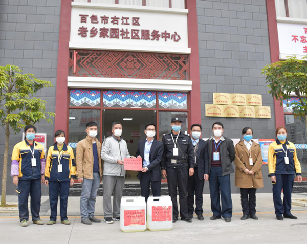 右江區(qū)總工會領(lǐng)導向老鄉(xiāng)家園-迎龍安置小鎮(zhèn)服務企業(yè)益眾物業(yè)公司捐贈防疫物資