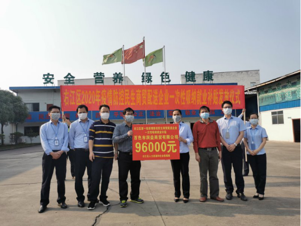 ??? 2020年2月29日,右江區(qū)人力資源和社會(huì)保障局黃彬副局長(zhǎng)、就業(yè)服務(wù)中心黃瑞珉主任、右江區(qū)國(guó)有資產(chǎn)管理中心黃紹雷副主任,在潤(rùn)益商貿(mào)公司舉行2020年疫情防控民生商貿(mào)配送企業(yè)一次性吸納就業(yè)補(bǔ)貼發(fā)放儀式。