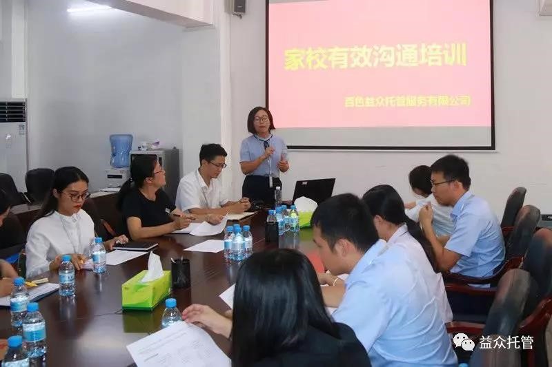 ??? 為持續(xù)提升公司服務(wù)團隊業(yè)務(wù)能力,做好家校溝通,建設(shè)家校高效溝通渠道,更好地為廣大學(xué)生提供優(yōu)質(zhì)的托管服務(wù)。2018年9月30日,百色益眾托管服務(wù)有限公司邀請從事教育培訓(xùn)行業(yè)15年的國家級講師唐秋艷老師為公司管理團隊開展第三期“有效的家校溝通”專題培訓(xùn)。
