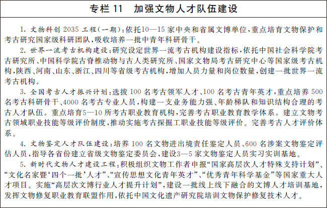 培育一批以領(lǐng)軍人才和中青年骨干創(chuàng)新人才為重點的高層次文物人才,加強(qiáng)考古、科技創(chuàng)新、文物鑒定、文物修復(fù)、文物展覽等急需領(lǐng)域人才培養(yǎng),加快建設(shè)一支門類齊全、技藝精湛的文物技能人才隊伍,穩(wěn)步造就一支科技研發(fā)能力和技術(shù)應(yīng)用能力過硬的文物科技人才隊伍,錘煉一支熟悉專業(yè)、素質(zhì)優(yōu)良的文物管理人才隊伍。加強(qiáng)相關(guān)行業(yè)文物保護(hù)人才培養(yǎng)。