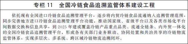 加快建設全國性冷鏈物流追溯監(jiān)管平臺,完善全鏈條監(jiān)管機制,針對冷鏈物流環(huán)境、主要作業(yè)環(huán)節(jié)、設施設備管理等重點,規(guī)范實時監(jiān)測、及時處置、評估反饋等監(jiān)管過程,逐步分類實現(xiàn)全程可視可控、可溯源、可追查。創(chuàng)新監(jiān)管手段,加大現(xiàn)代信息技術和設施設備應用力度,強化現(xiàn)場和非現(xiàn)場監(jiān)管方式有機結合。借鑒新冠肺炎疫情防控期間進口冷鏈食品檢驗檢測檢疫經(jīng)驗做法,優(yōu)化完善工作機制,建立科學、可靠、高效的冷鏈物流檢驗檢測檢疫體系。