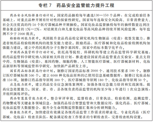 完善藥品安全監(jiān)管制度。加強藥物臨床試驗核查,嚴格執(zhí)行藥品、醫(yī)療器械、化妝品等生產(chǎn)質(zhì)量管理規(guī)范,對重點生產(chǎn)企業(yè)開展全覆蓋檢查。開展藥品質(zhì)量提升行動,健全生物制品等高風險產(chǎn)品標準制定工作機制,提高藥品、醫(yī)療器械、化妝品標準。改革和完善疫苗監(jiān)管體制機制,提高省級藥品檢驗檢測機構(gòu)對轄區(qū)內(nèi)生產(chǎn)的主要疫苗品種批簽發(fā)能力。深入開展無菌植入性醫(yī)療器械監(jiān)督檢查、化妝品“線上凈網(wǎng)、線下清源”等專項整治行動,切實規(guī)范藥品、醫(yī)療器械、化妝品市場秩序。