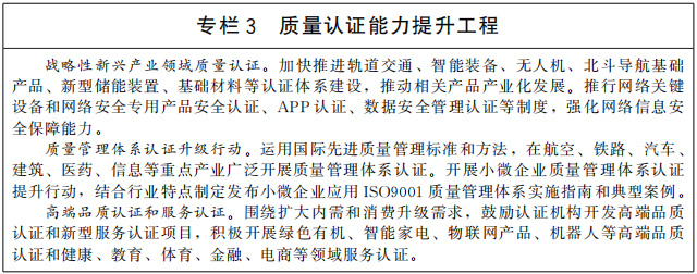 提高質(zhì)量認證服務(wù)能力。加快構(gòu)建統(tǒng)一管理、共同實施、權(quán)威公信、通用互認的質(zhì)量認證體系,全面提升質(zhì)量認證服務(wù)能力,打造一批具有國際競爭力的認證品牌。推動完善重點產(chǎn)業(yè)質(zhì)量認證制度體系,加大網(wǎng)絡(luò)安全認證制度推行力度,加快戰(zhàn)略性新興產(chǎn)業(yè)領(lǐng)域質(zhì)量認證制度建設(shè),大力推行高端品質(zhì)認證和新型服務(wù)認證,加快研究和完善國家數(shù)據(jù)安全標準與認證認可體系。廣泛開展質(zhì)量管理體系認證升級行動。健全政府、行業(yè)、社會等多層面的認證采信機制,推動在市場采購、行業(yè)管理、行政監(jiān)管、社會治理等領(lǐng)域廣泛采信認證結(jié)果。提升認證行業(yè)專業(yè)化集約化水平,優(yōu)化行業(yè)布局結(jié)構(gòu),推動認證行業(yè)數(shù)字化發(fā)展。