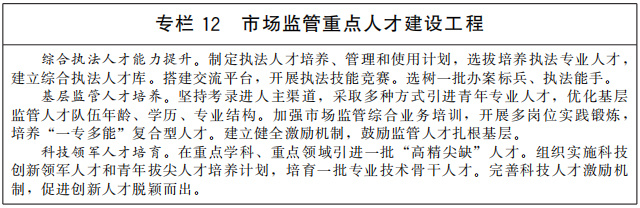 加強人才隊伍建設(shè)。健全人才引進、培養(yǎng)、使用、評價、激勵機制,統(tǒng)籌推進市場監(jiān)管人才隊伍建設(shè)。加快高水平市場監(jiān)管智庫和綜合型研究機構(gòu)建設(shè),加強重大理論和實踐問題戰(zhàn)略研究、決策咨詢,開展人才需求分析。推進市場監(jiān)管人才培養(yǎng),加快相關(guān)學科專業(yè)建設(shè),培養(yǎng)符合市場監(jiān)管現(xiàn)代化需求的后備人才。在檢驗檢測、藥品審評、檢查核查、網(wǎng)絡(luò)數(shù)據(jù)監(jiān)管、知識產(chǎn)權(quán)、質(zhì)量技術(shù)等重點專業(yè)領(lǐng)域,著力培養(yǎng)引進一批“高精尖缺”人才。組織開展綜合執(zhí)法大練兵,提升基層人才隊伍能力水平。加強市場監(jiān)管文化建設(shè),增進價值認同、情感認同、文化認同,增強做好市場監(jiān)管工作的責任感和使命感。