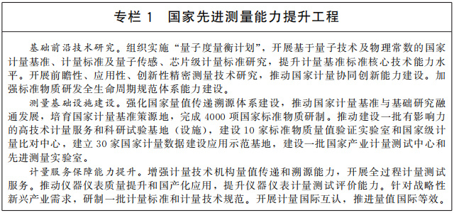 構(gòu)建現(xiàn)代先進測量體系。加強以量子計量為核心的先進測量體系建設(shè),加快建立新一代國家計量基準,推進社會公用計量標準升級換代,制定一批關(guān)系國計民生的重要計量技術(shù)規(guī)范。改革完善計量器具型式批準、檢定、法制監(jiān)督等管理制度,對強制管理的計量器具目錄實施動態(tài)調(diào)整,完善商品量、計量數(shù)據(jù)等量值監(jiān)管制度。深入推進計量技術(shù)機構(gòu)改革創(chuàng)新發(fā)展,探索計量校準市場和校準機構(gòu)建設(shè)的有效途徑,規(guī)范計量校準市場,滿足市場對量值溯源和測試服務(wù)的需求。建立國家計量數(shù)據(jù)建設(shè)應(yīng)用示范基地,提升國家產(chǎn)業(yè)計量測試和能源計量能力。積極參與國際計量比對,提升國際承認的校準與測量能力。